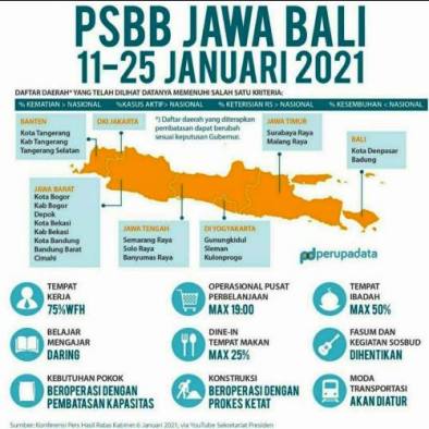 Sebagaimana diberitakan, Airlangga Hartarto, Ketua Komite Penanganan Covid-19 dan Pemulihan Ekonomi Nasional saat jumpa pers virtual, Rabu (6/1/2020), menyatakan sejumlah wilayah di Jawa-Bali yang dilakukan pembatasan aktivitas yakni :