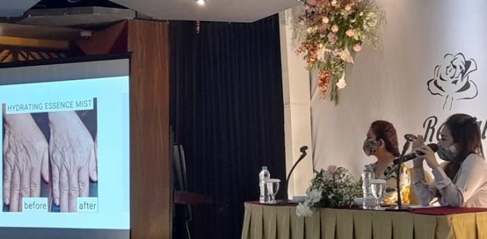 Iin lalu memaparkan lima produk Drialogy, yaitu Hydrating Facial Wash, Hydrating Essence Mist, Hydrating Sunscreen, Firming Breast Lotion, dan Snow Bright Serum.