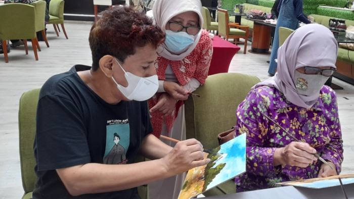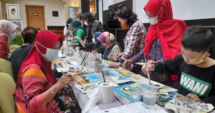 Hamid Nabhan di tengah peserta workshop melukis Impresionis di Cafe Taman Surabaya Suites Hotel, Kamis (25/3/2021).