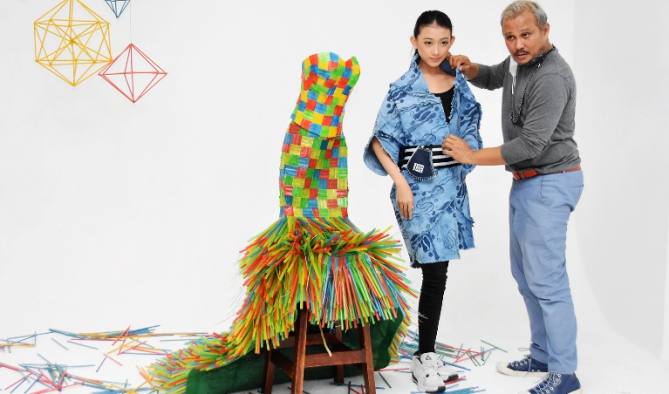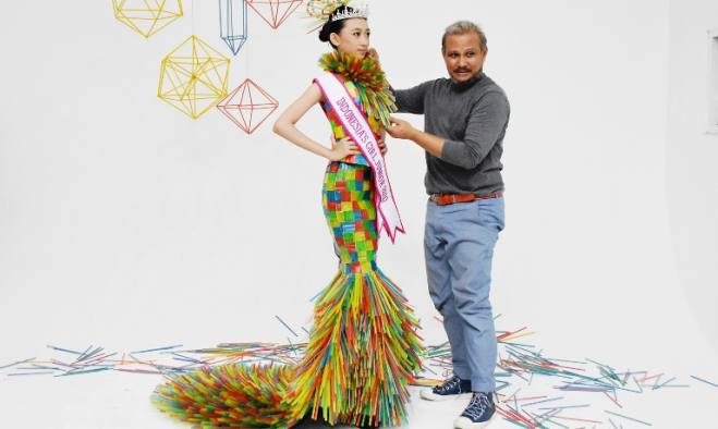 Dylla Rahma Febriani bersama desainer Embran Nawawi memanfaatkan sedotan plastik sebagai bahan desain busana ala Mermaid. Karya dengan konsep ‘Save the Planet from Micro Plastics’ ini selanjutnya diperagakan pada 22 April mendatang untuk memperingati Hari Bumi.