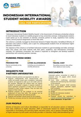 Program beasiswa IISMA ini terbuka bagi mahasiswa S1 yang berminat melakukan pertukaran di perguruan tinggi luar negeri. peserta IISMA akan menjalani pendidikan selama satu hingga dua semester, dan mahasiswa yang bersangkutan akan mendapatkan kredit sebanyak 20 SKS.