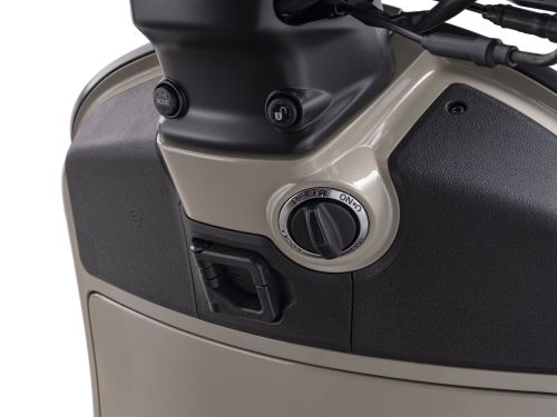 Vespa GTV tersedia dalam varian warna Beige Sabbia. Model ini menawarkan kombinasi yang menarik antara warna khas Beige dengan corak grafis oranye yang kontras di sepanjang panel kendaraan.