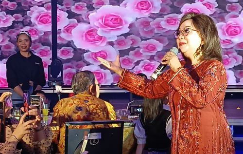 Tetty Kadi masih energik dan tampil penuh pesona saat menghibur tamu di malam tahun baru yang diadakan Leedon Hotel & Suites Surabaya.