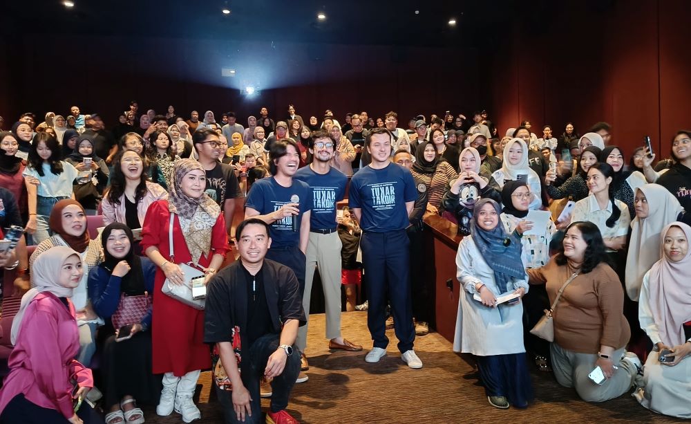 Suasana acara nonton bareng film 'Tukar Takdir' di Studio XXI Tunjungan Plaza 3 Surabaya yang dihadiri Nicholas Saputra, Ariyo Wahab, dan Revaldo.