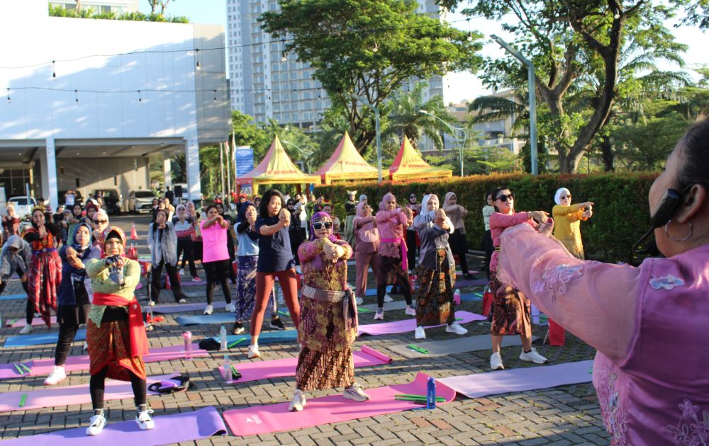 Sambil menggerakkan ripstix di kedua tangan masing-masing, sekitar 60 peserta yang mayoritas memakai kebaya tampak semangat mengikuti gerakan demi gerakan yang diperagakan instruktur dari Fit Hub.