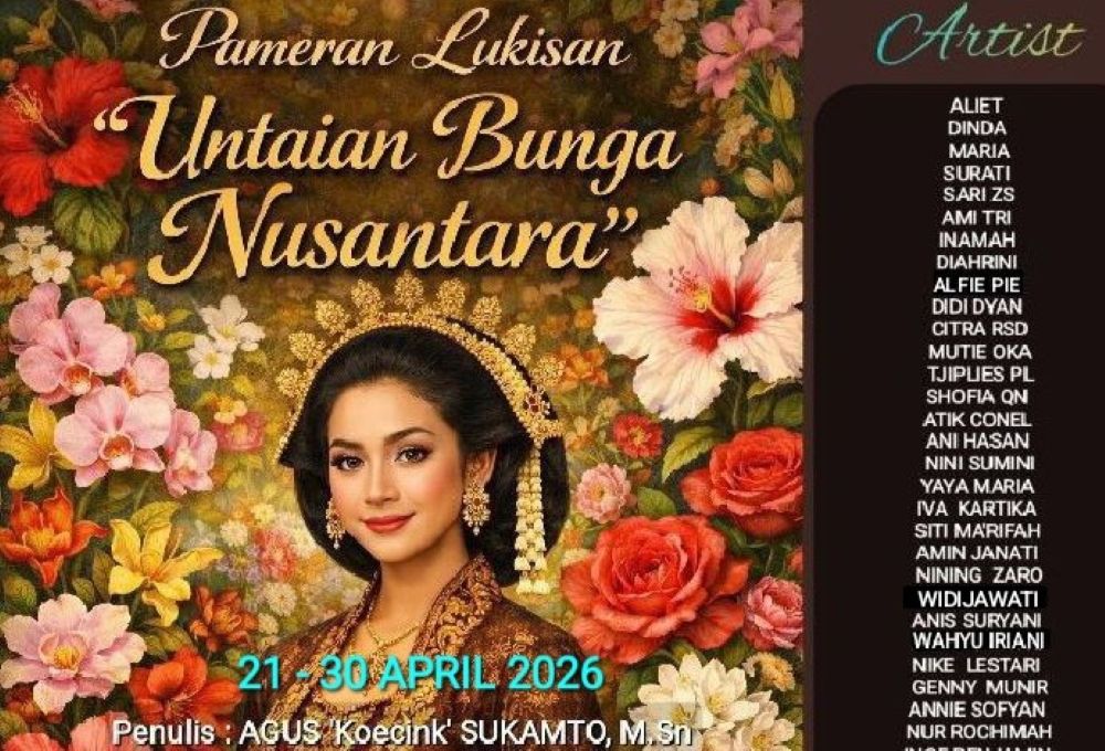 Pameran seni rupa bertajuk ‘Untaian Bunga Nusantara’ dimulai tepat di Hari Kartini, Selasa (21/4/2026) hingga 30 April mendatang. “Pameran ini menjadi ajang ke-9 yang diselenggarakan sejak komunitas ini berdiri pada 1 Agustus 2023,” ungkap Aliet, ketua panitia pameran lukisan tersebut.